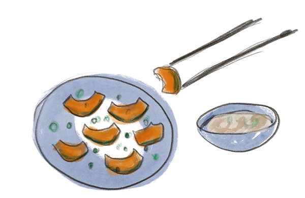 Kurpitsan voi leikata lohkoiksi, kuutioiksi tai vaikka kaareviksi "ranskalaisiksi" – ja tarjoilla lähes minkä tahansa pääruoan kanssa.